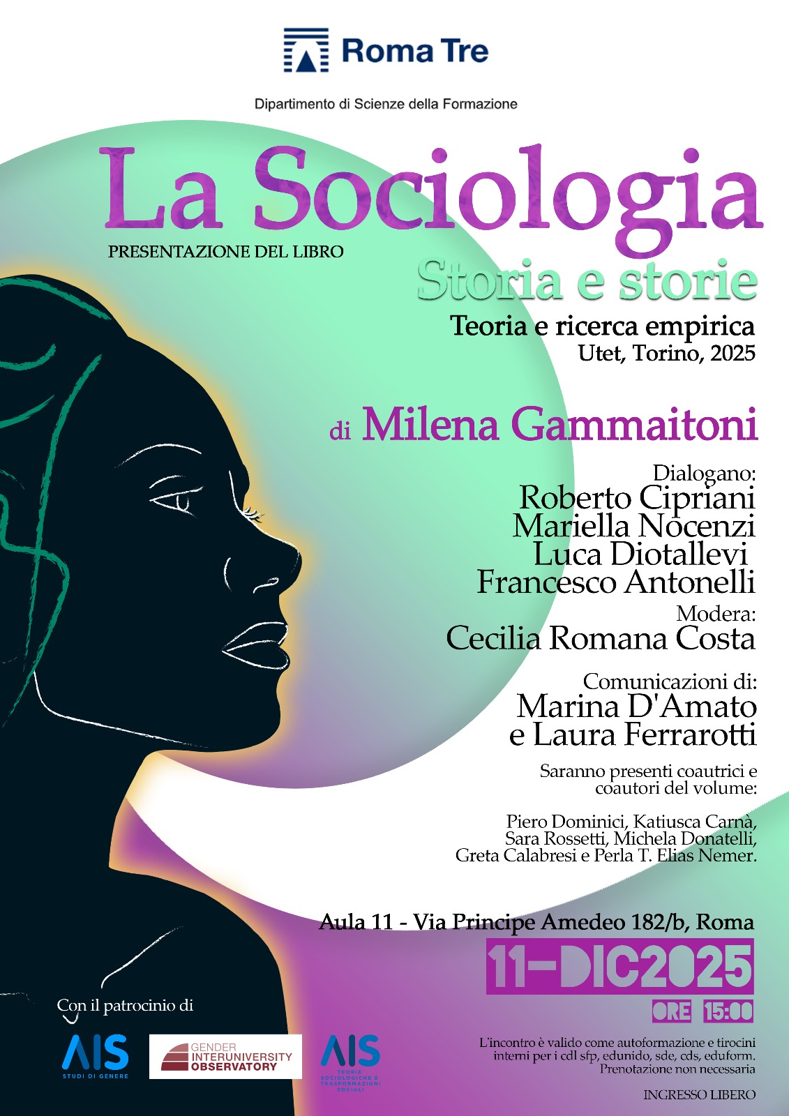 Il prossimo 11 dicembre alle 15:00, presso l’Aula 11 del Dipartimento di Scienze della Formazione dell’Università Roma Tre (Via Principe Amedeo, 182/b), con il patrocinio di AIS sezioni “Studi di Genere” e “Teorie Sociologiche e Trasformazioni Sociali” e del Gender Interuniversity Observatory, sarà presentato il mio nuovo libro La Sociologia. Storia e Storie. Teoria e Ricerca Empirica (UTET Università, Torino, 2025).